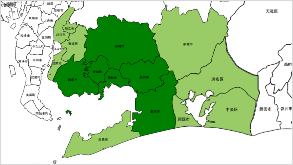 蒲郡市、豊川市、豊橋市、幸田町、西尾市、岡崎市の全域